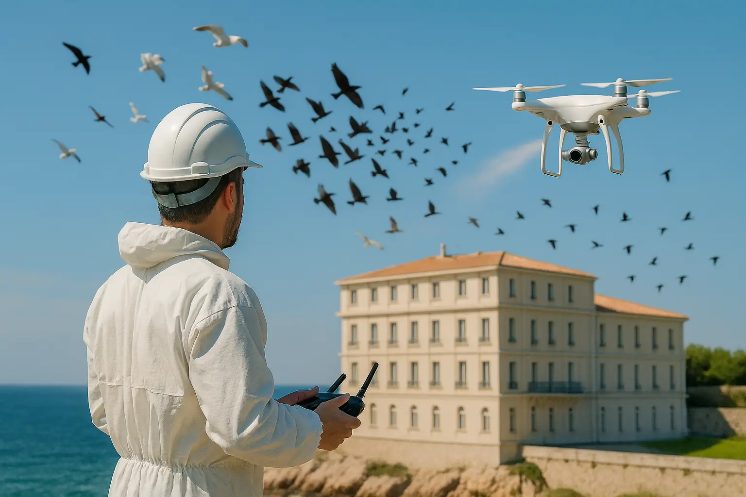 Goélands, gabians, pigeons et étourneaux provoquent chaque année d’importantes nuisances dans les villes côtières comme Marseille, Toulon ou Aix-en-Provence : fientes corrosives, nuisances sonores, dégradations de façades et de véhicules, risques sanitaires… Le drone d’effarouchement offre une solution moderne, non létale et durable pour déplacer les colonies vers des zones moins sensibles.